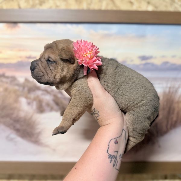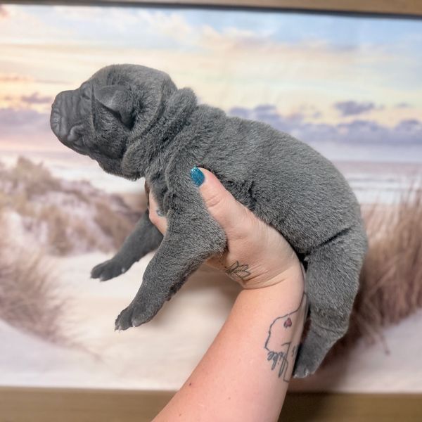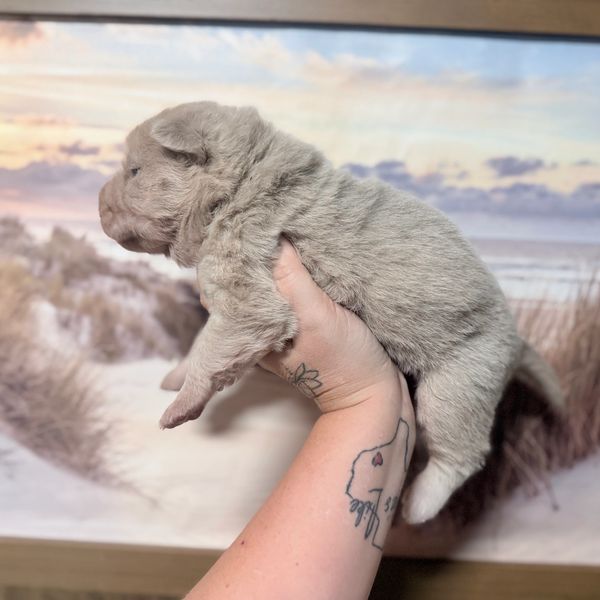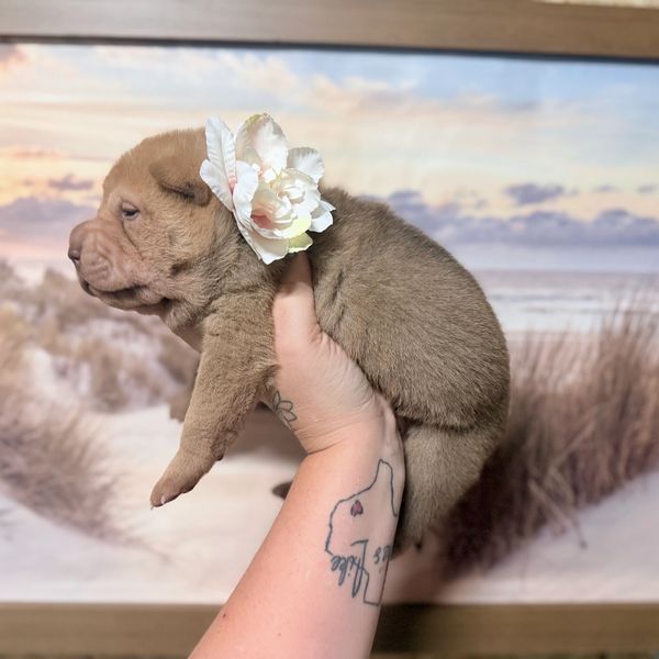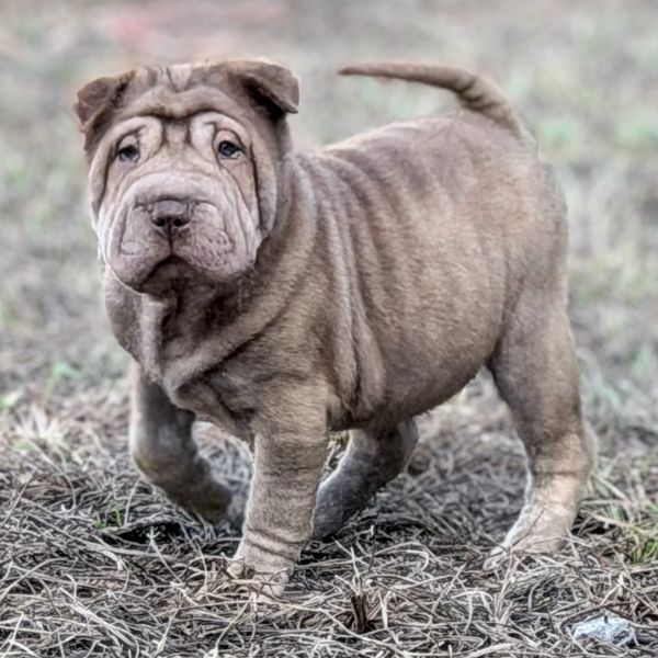 Spider is a Brush Coat male. Guaranteed to be Sharpei Fever Single Carrier and PLL/POAG Clear. Given he is a Brush coat this means that her coat will be medium length and soft. Spider's parents are Porchia & Hug (Hug is also our producing out of Rocky & Mocha) and Porchia from (Pig & Bentley).